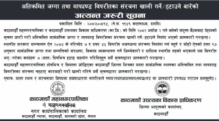 महानगर र प्राधिकरणले आज एक संयुक्त सार्वजनिक सूचना जारी गर्दै असोज २ गते बसेको काठमाडौँ महानगरपालिका र काठमाडौँ उपत्यका प्राधिकरणको निर्णय अनुसार सात दिनभित्र अतिक्रमित जग्गा र मापदण्ड विपरीतका संरचना खाली गर्न निर्देशन दिइएको हो ।