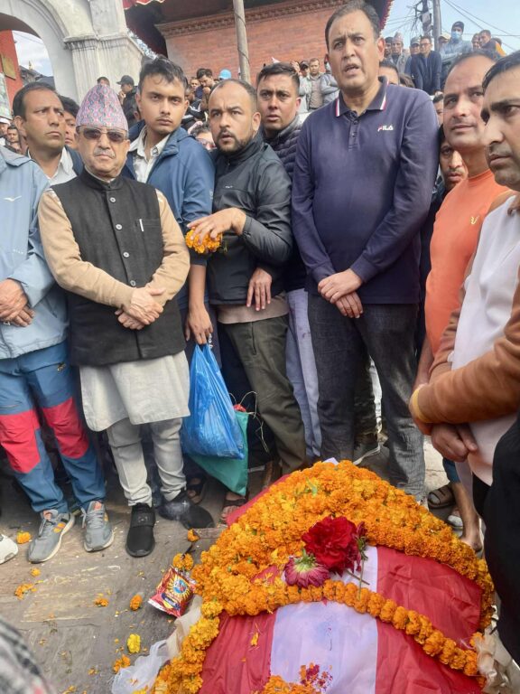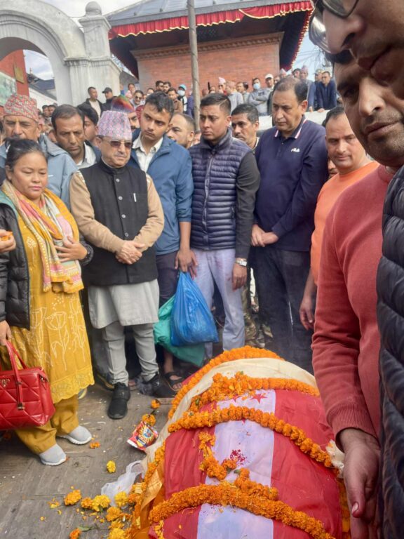 आज (सोमबार) बिहान सम्पन्न अन्त्येष्टि कार्यक्रममा सभापति खड्काले स्व.खतिवडाको पार्थिव शरीरमा नेपाली कांग्रेसको चारतारे झण्डा ओढाएर श्रद्धाञ्जलि व्यक्त गरेका थिए।