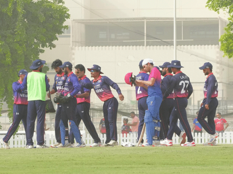 त्यसअघि, ब्याटिङ गरेको नेपालको लागि भीम सार्कीले सर्वाधिक ४८ रन बनाए। उनले ६८ बलमा ४ चौका प्रहार गरे।