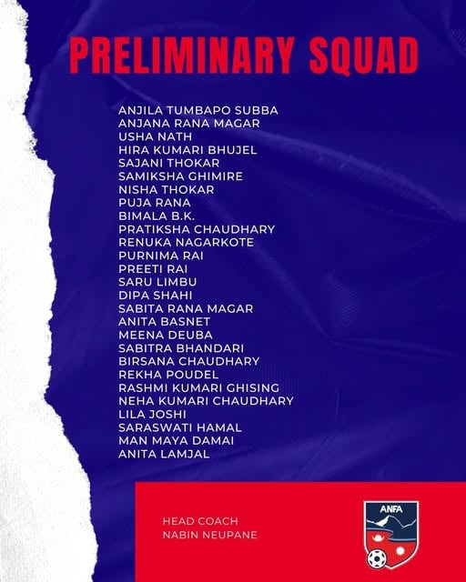 बुधबार नेपाली राष्ट्रिय महिला फुटबल टिमका मुख्य प्रशिक्षक नवीन न्यौपानेले मैत्रीपूर्ण फुटबलको निम्ति २७ सदस्यीय प्रारम्भिक राष्ट्रिय टोली घोषणा गरेका हुन् ।