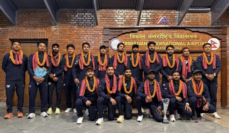 काठमाडौं । विश्वकप छनोट तथा यूएईमा एकदिवसीय र वेस्ट इण्डिजविरुद्ध सिरिज खेलेर नेपाली राष्ट्रिय क्रिकेट टोली स्वदेश फर्किएको छ ।
