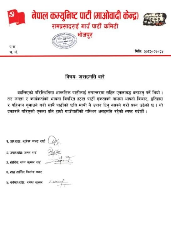 विज्ञप्तिमा अध्यक्ष शुरेसचन्द राई, अमर राई, सचिव सोमकुमार राई, सह-सचिव विनोद मगर र कोषाध्यक्ष रमेश सुनारले हस्ताक्षर गरेका छन् ।