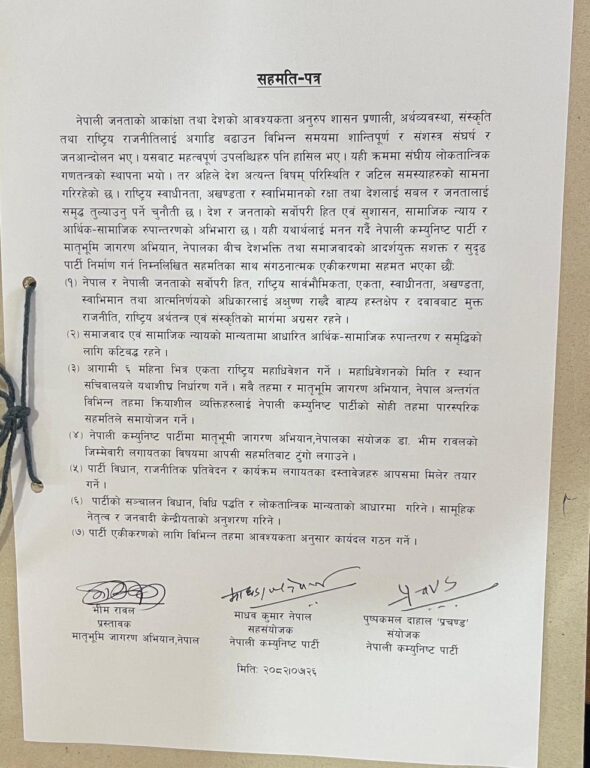 काठमाडौं । नेपाली कम्युनिस्ट पार्टी (नेकपा) र भीम रावल नेतृत्वको मातृभूमि जागरण अभियान, नेपालबिच ७ बुँदे सहमति भएको छ ।