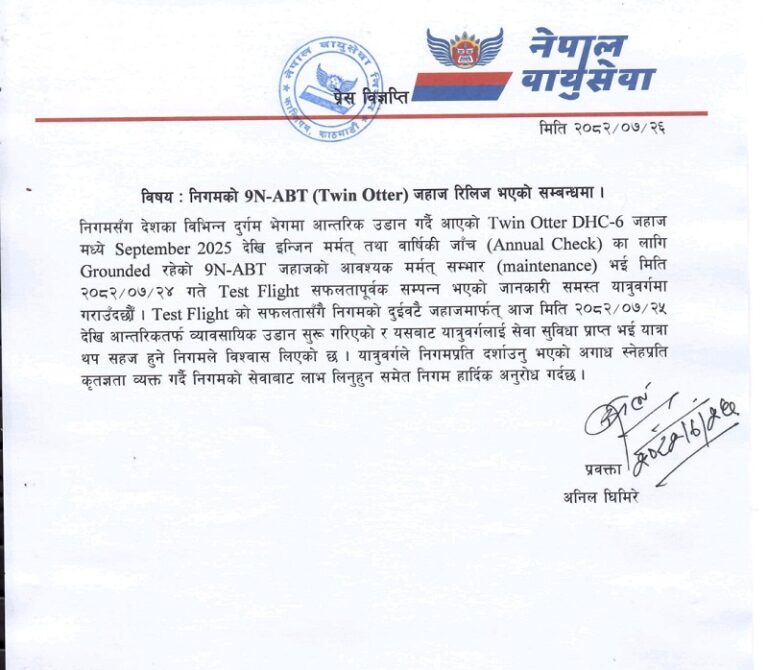 निगमका प्रवक्ता अनिल घिमिरेले हिजो विज्ञप्ति निकाल्दै देशका दुर्गम क्षेत्रमा सेवा दिँदै आएको ट्वीनअटर विमान मर्मत र परीक्षण उडान सफलतापूर्वक सम्पन्न भएको जानकारी दिए ।