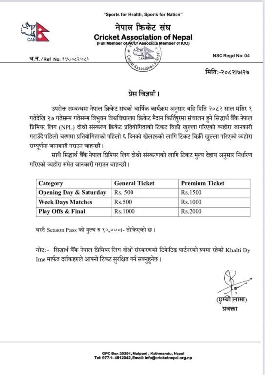 अन्य समूह चरणमा साधारणतर्फ ५ सय र भीआईपीतर्फ एक हजार रुपैयाँ रहनेछ भने प्लेअफ तथा फाइनलका लागि साधारणतर्फ एक हजार र भीआईपीतर्फ दुई हजार रुपैयाँ तिर्नुपर्ने क्यानले जनाएको छ । साथै सिजनभरको पास १५ हजार रुपैयाँमा किन्न सकिनेछ ।