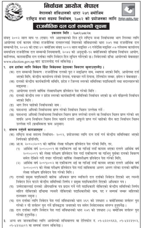 निर्वाचनमा भाग लिन चाहने दलहरूले केन्द्रीय समितिबाट भएको निर्णयको प्रतिलिपि, वार्षिक लेखा परीक्षण प्रतिवेदन तथा अन्य आवश्यक कागजातसहित आयोगमा निवेदन पेस गर्न भनेको छ । आयोगले दल दर्ताका लागि आह्वान गरेको छ ।