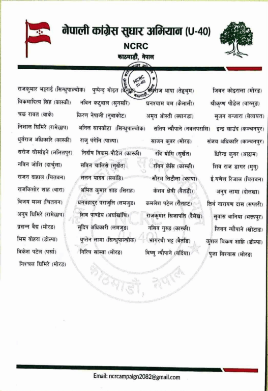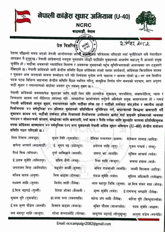 विज्ञप्तिमा भनिएको छ, ‘नेपाली काँग्रेसको आमूल सुधार, रूपान्तरणका लागि पार्टीका हरेक तह र पार्टीको तर्फबाट सङ्घ, प्रदेश र स्थानीय तहको निर्वाचनमा ४० वर्षमुनिका ४० प्रतिशत युवाहरूको प्रतिनिधित्व सुनिश्चित गर्न, भ्रष्टाचारको विरुद्धमा खबरदारी गर्दै सुशासन कायम गर्न, पार्टीको तर्फबाट हरेक निकायको निर्वाचनमा उम्मेदवार छनोट गर्दा प्राइमरी इलेक्सनको व्यवस्था गराउन र लोकतन्त्रको संरक्षण, संवर्द्धनका लागि खबरदारी, नयाँ बहस र पैरवी गर्नका लागि सुरुवाती चरणमा प्रतिनिधिमूलक रूपमा ४० वर्षमुनिका १०१ जना युवाहरूको नेपाली काँग्रेस सुधार अभियान केन्द्रीय संयोजन समिति गठन गरिएको छ ।’