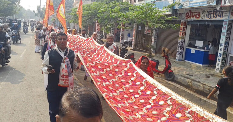 काठमाडौं । सीता-राम विवाहपञ्चमीको अवसर पारेर जनकपुरधामस्थित जानकी मन्दिरमा १ सय ११ मिटर लामो चुनरी चढाइएको छ ।
