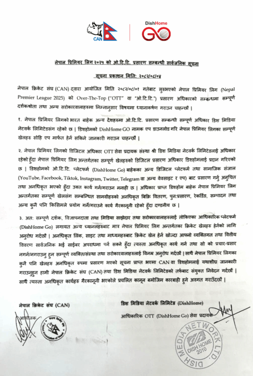 “अधिकार प्राप्त डिसहोमबाहेक नेपाल प्रिमियर लिगअन्तर्गतका सम्पूर्ण खेलसँग सम्बन्धित सामग्रीहरूको अनधिकृत बिक्री वितरण, पुन: प्रसारण, रेकर्डिङ, सम्पादन तथा अन्य कुनै पनि किसिमले प्रयोग गर्ने/गराउने कार्य गैरकानुनी रहेको हुँदा दण्डनीय छ,” क्यान र डिसहोमले जारी गरेको संयुक्त विज्ञप्तिमा भनिएको छ ।