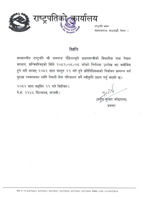 “सम्माननीय राष्ट्रपति श्री रामचन्द्र पौडेलज्यूले प्रधानमन्त्रीको सिफारिस तथा नेपाल सरकार, मन्त्रिपरिषद्को मिति २०८२/०८/०८ गतेको निर्णयमा उल्लेख भए बमोजिम हुने गरी सम्वत् २०८२ साल फागुन २१ गते हुने प्रतिनिधिसभाको निर्वाचन सम्पन्न गर्न सुरक्षा व्यवस्थाका लागि नेपाली सेना परिचालन गर्ने स्वीकृति प्रदान गर्नु भएको छ,” राष्ट्रपति कार्यालयले बिहीबार जारी गरेको विज्ञप्तिमा भनिएको छ ।