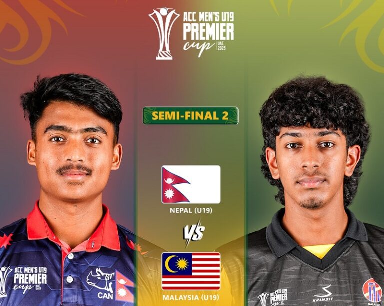काठमाडौं । संयुक्त अरब इमिरेट्स (यूएई) मा चलिरहेको एसीसी पुरुष १९ वर्षमुनिको प्रिमियर कप क्रिकेट प्रतियोगिताको सेमिफाइनलमा नेपालले आज मलेशियासँग खेल्दैछ । खेल अजमान मैदानमा नेपाली समयअनुसार बिहान ९ बजेदेखि शुरु हुनेछ ।