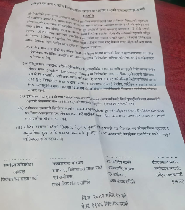 रास्वपाका तर्फबाट कार्यवाहक सभापति डोलप्रसाद अर्याल र डा। स्वर्णिम वाग्लेले हस्ताक्षर गरेका छन् भने विवेकशील साझाकी अध्यक्ष समीक्षा बाँस्कोटा र उपाध्यक्ष प्रकाशचन्द्र परियारबीच हस्ताक्षर भएको हो ।