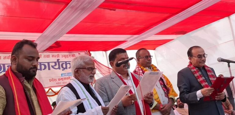 नवनियुक्त मन्त्रीहरुलाई प्रदेश प्रमुख डा. सुरेन्द्र लाभ कर्णले पद तथा गोपनीयताको सपथ गराएका छन् ।