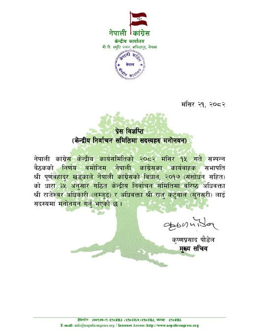 कार्यवाहक सभापति पूर्णबहादुर खड्काले वरिष्ठ अधिवक्ता राजेश्वर अधिकारी (लम्जुङ) र अधिवक्ता राजु कटुवाल (सुनसरी) लाई केन्द्रीय निर्वाचन समितिको सदस्यमा मनोनयन गरेका हुन् ।