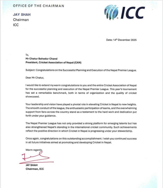 विश्व क्रिकेटको सर्वोच्च निकाय आईसीसीले आइतबार नेपाल क्रिकेट संघ (क्यान)का अध्यक्ष चतुरबहादुर चन्दलाई पत्र लेख्दै बधाई दिएको हो । “नेपाल प्रिमियर लिगको सफल योजना र कार्यान्वायनका निम्ति म नेपाल क्रिकेट संघलाई न्यानो बधाई दिन चाहन्छु,” आईसीसीको पत्रमा उल्लेख छ ।