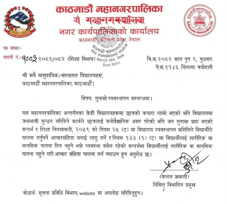केही सामुदायिक तथा संस्थागत (निजी) विद्यालयहरूले छात्रहरूको कपाल लामो भएको निहुँमा अभिभावकको अनुमति बेगर र विद्यार्थीको आत्मसम्मानमा चोट पुग्ने गरी विद्यालय हाताभित्रै कपाल मुण्डन गरिदिने गरेका गुनासाहरू बाहिर आएका थिए । यस्तो कार्यले किशोर विद्यार्थीहरूमा हिनताबोध सिर्जना हुने र त्यसले बालमनोविज्ञानमा गहिरो धक्का लाग्ने ठहर गर्दै महानगरको शिक्षा विभागले बुधबार सबै विद्यालयका नाममा विशेष परिपत्र जारी गरेको छ ।