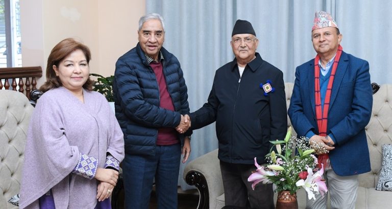 यसअघि मंसिर १० गते पनि एमाले अध्यक्ष ओली पत्नी राधिका शाक्यलाई लिएर देउवालाई भेट्न गएका थिए ।