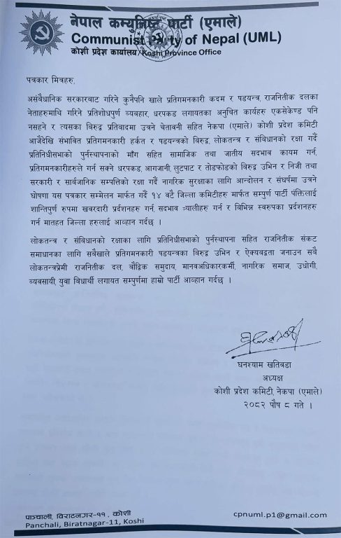 कोशी इन्चार्ज एवं पार्टी सचिव शेरधन राईले भने, ‘सरकारले गर्न सक्ने धरपकड, आगजानी, लुटपाट र तोडफोडका विरुद्ध उभिन र निजी तथा सरकारी र सार्वजनिक सम्पत्तिको रक्षा गर्दै नागरिक सुरक्षाका लागि आन्दोलन र जिल्ला कमिटी मार्फत सम्पूर्ण पार्टी पङ्क्तिलाई शान्तिपूर्ण रुपमा खबरदारी गर्न, सद्भाव र्यालीहरू गर्न र विभिन्न स्वरुपका प्रदर्शन गर्न मातहतका जिल्लालाई आह्वान गर्दछु ।’