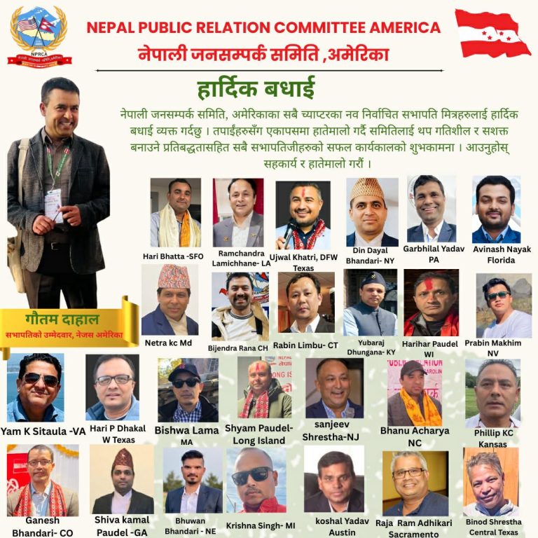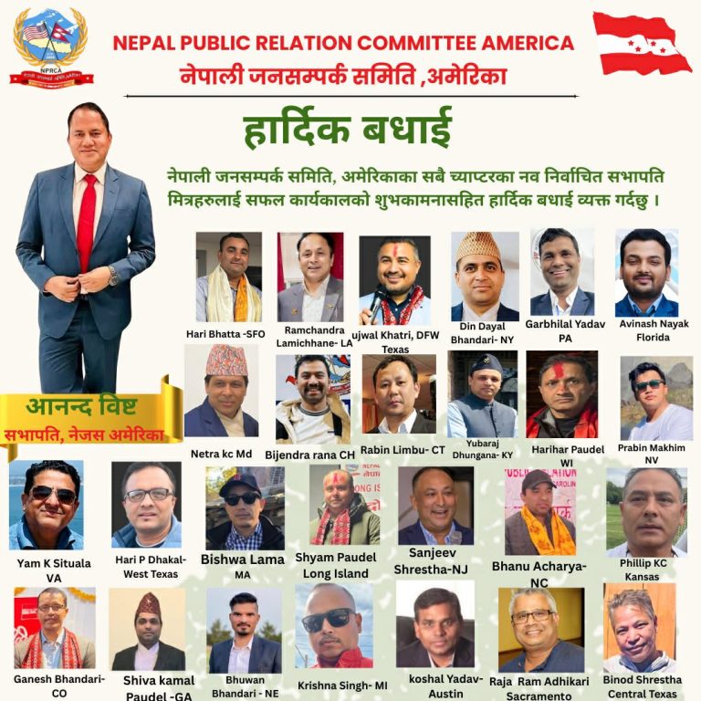नेपाली जनसम्पर्क समिति,अमेरिकाका सबै च्याप्टरहरुमा निर्विरोध नेतृत्व चयन सम्पन्न भएको छ। गत शनिवार एकैसाथ सम्पन्न सबै च्याप्टरहरुको अधिवेशनमार्फत यसरी सर्वसम्मत रुपमा नयाँ नेतृत्व निर्विरोध निर्वाचित भएको हो। च्याप्टर अधिवेशन सफलतापूर्वक सम्पन्न भएको समितिका केन्द्रीय सभापति एवं नेपाली कांग्रेसका पूर्व आमन्त्रित केन्द्रीय सदस्य आनन्द विष्टले जानकारी दिनु भएको छ। ‘हामीले एकैपटक अमेरिकाभर सबै च्याप्टरको अधिवेशन र नयाँ नेतृत्व चयन गर्ने कार्य भाडो उत्साह र हार्दिकताका साथ सम्पन्न गरेका छौं र अब हामी पार्टी नेतृत्वसंग समन्वय गरेर छिट्टै समितिको केन्द्रीय अधिवेशन सम्पन्न गर्छौं’ सभापति विष्टले भने।