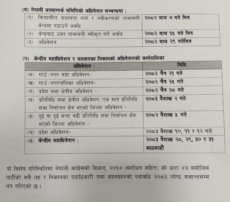 त्यस्तै प्रतिनिधिसभा क्षेत्री अधिवेशन/एक मात्र प्रतिनिधिसभा निर्वाचन क्षेत्र भएको जिल्ला अधिवेशन २०८३ वैशाख २ गते, दुई वा दुईभन्दा बढी प्रतिनिधिसभा निर्वाचन क्षेत्र भएको जिल्ला अधिवेशन २०८३ वैशाख ५ गते गर्ने भनिएको छ ।