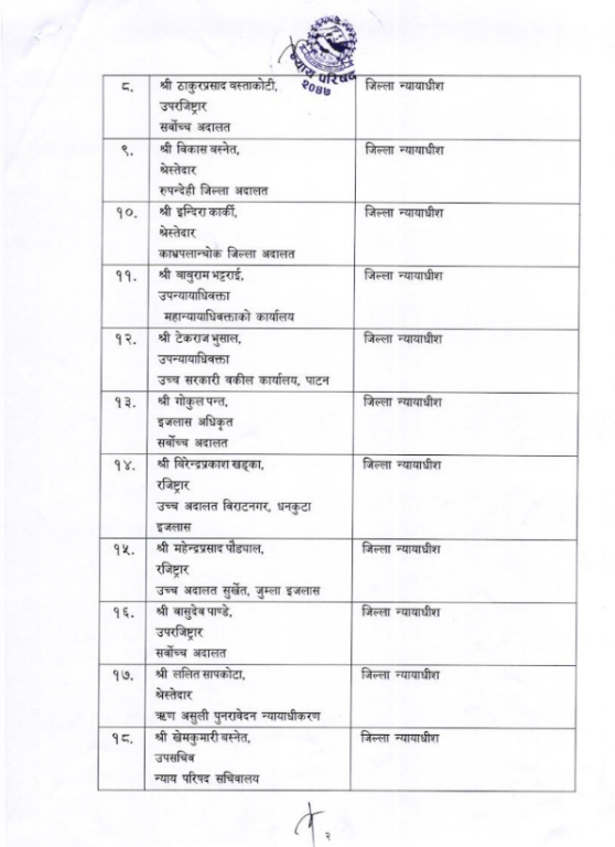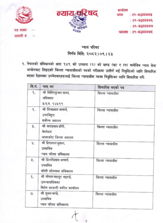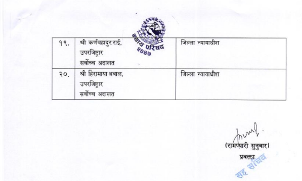 काठमाडौँ । न्याय परिषद्ले जिल्ला अदालतमा २० जना न्यायाधीशलाई नियुक्त गर्न सिफारिस गरेको छ। बुधबार परिषद्ले न्याय सेवा आयोगबाट लिइएको जिल्ला न्यायाधीश पदको परीक्षामा उत्तीर्ण भएर नियुक्तिका लागि २० जनालाई सिफारिस गरेको हो। २० जनामध्ये शिशिरकुमार यादव पहिलो नम्बरमा छन्।
