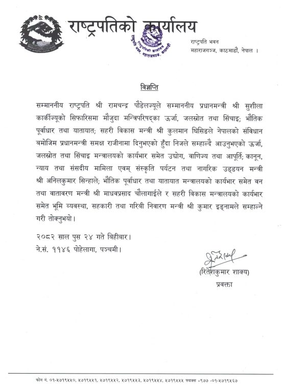 प्रधानमन्त्री सुशीला कार्कीको सिफारिसमा राष्ट्रपति रामचन्द्र पाैडेलले मन्त्रिपरिषद् सदस्यको जिम्मेवारी हेरफेर गरेका हुन् । कुलमान घिसिङको राजीनामापछि रिक्त रहेका तीन मन्त्रालयको जिम्मेवारी तोकिएको हो ।