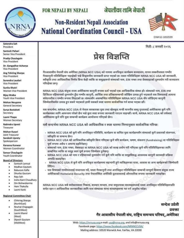 विज्ञप्तिमा भनिएको छ, ‘एनआरएनए अमेरिकाको नाममा अनधिकृत कार्यक्रम खडा गरी मानव तस्करीजस्ता गैरकानुनी काम भइरहेको विश्वसनीय सूचना हामीलाई प्राप्त भएको छ । अमेरिकामा विधिवत् दर्ता भएको संस्थाको साख गिराउने गरी भइरहेका यस्ता गतिविधिप्रति हामी सचेत छौँ ।’