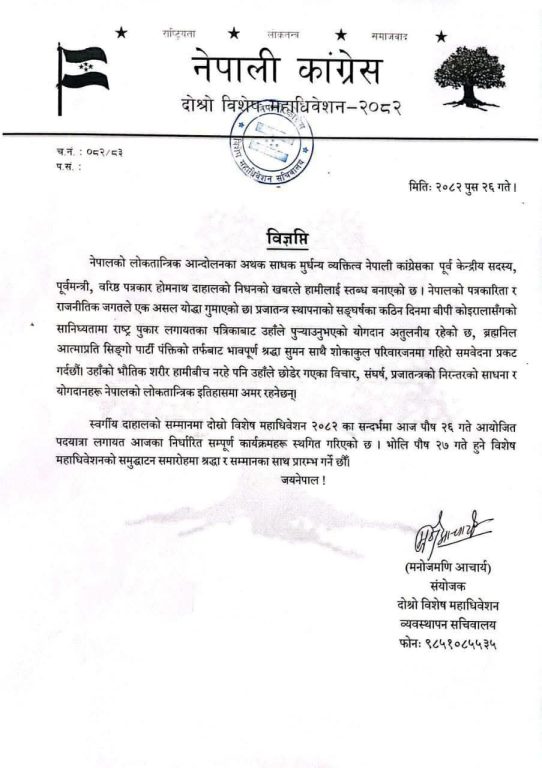 शनिबार दोश्रो विशेष महाधिवेशन व्यवस्थापन सचिवालयले एक विज्ञप्ति जारी गर्दै पदयात्रा लगायतका कार्यक्रम स्थगित गरिएको जानकारी दिएको छ । आइतबार हुने विशेष महाधिवेशन समुद्घाटन समारोह भने उनको श्रद्धा र सम्मानका साथ प्रारम्भ गर्ने सचिवालयले जनाएको छ ।
