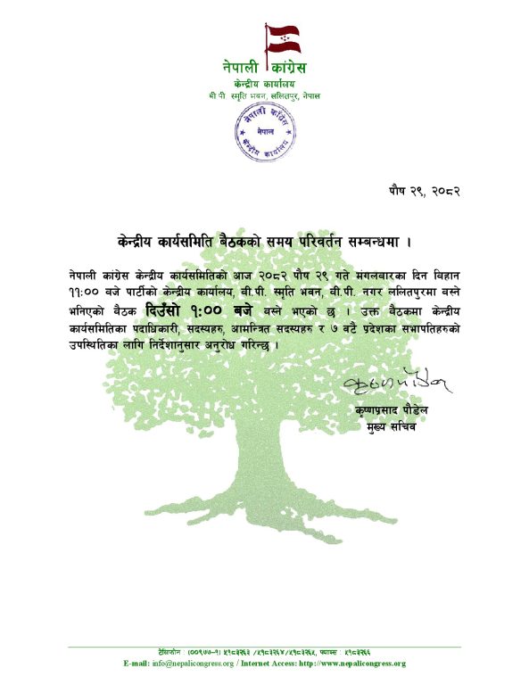 काठमाडौँ । नेपाली काँग्रेसको केन्द्रीय कार्यसमितिको बैठक सरेको छ । बिहान ११ बजे पार्टी केन्द्रीय कार्यालय सानेपामा बस्ने भनिएको बैठक दिउँसो १ बजेका लागि सरेको हो ।