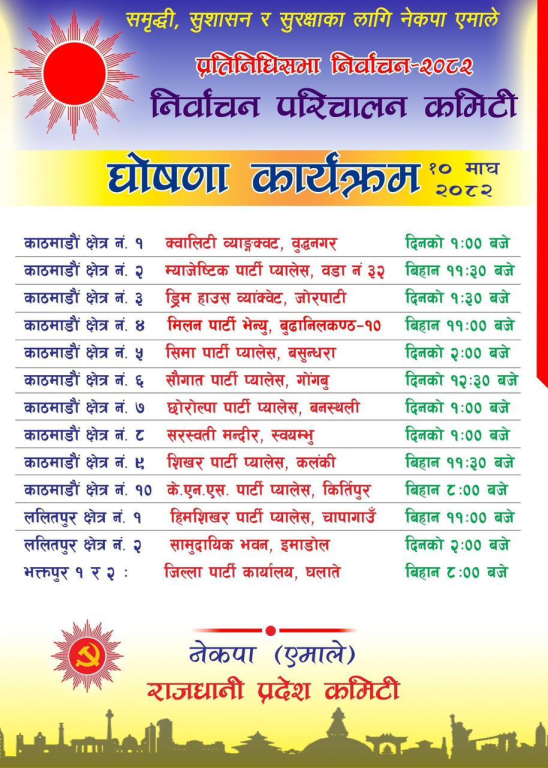 काठमाडौं । नेकपा एमालेले काठमाडौं उपत्यकाका १५ निर्वाचन क्षेत्रका उम्मेदवारको परिचयात्मक तथा घोषणा कार्यक्रम गर्ने भएको छ । कार्यक्रम १४ ठाउँमा फरक फरक आयोजना गरिने केन्द्रीय सदस्य भोलानाथ पोखरेलले बताएका छन् ।