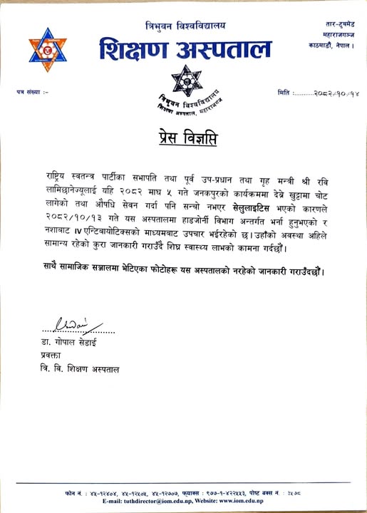 काठमाडौं । राष्ट्रिय स्वतन्त्र पार्टी (रास्वपा) का सभापति एवं पूर्वउपप्रधान तथा गृहमन्त्री रवि लामिछाने महाराजगन्जस्थित त्रिभुवन विश्वविद्यालय शिक्षण अस्पताल (टिचिङ) मा भर्ना भएको पुष्टि भएको छ । बायाँ खुट्टामा देखिएको समस्याका कारण उनलाई मंगलबार (माघ १३ गते) अस्पतालको हाडजोर्नी विभागमा भर्ना गरिएको हो ।