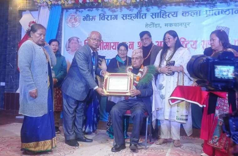 मकवानपुर । गीतकार किरण खरेललाई बिहीबार हेटौँडामा बिजुलीमाया वनः श्रेष्ठ अन्तरराष्ट्रिय सङ्गीत पुरस्कार प्रदान गरिएको छ । भीम विराग सङ्गीत साहित्य कला प्रतिष्ठान नेपालले हेटौँडा एक समारोहबीच रु एक लाख नगदसहित खरेललाई पुरस्कृत गरेको हो ।