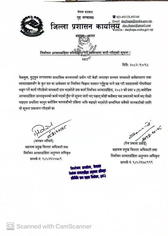 काठमाडौं । जिल्ला प्रशासन कार्यालय झापाले मतदाताहरूलाई ‘कुन उम्मेदवार र कुन चिह्नलाई मत दिनुहुन्छ भनेर सोध्न नपाउने निर्णय गरेको छ ।