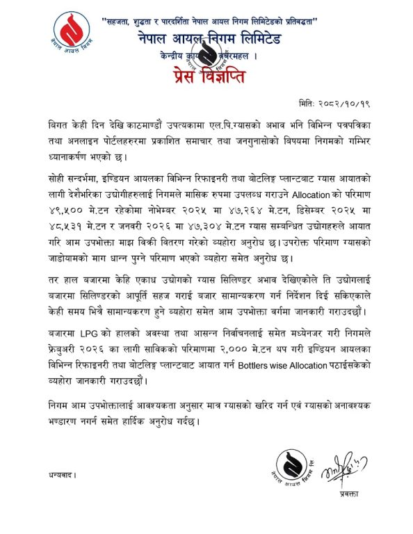 बजारमा एलपी ग्यासको अहिलेको अवस्था तथा आसन्न चुनावलाई समेत मध्यनजर गरी फेब्रुअरी महिनाका लागि साविकको परिणाममा दुई हजार मेट्रिक टन थप गरिएको उनले जानकारी दिए । आवश्यकताअनुसार मात्र ग्यासको खरिद गर्न एवम् ग्यासको अनावश्यक भण्डारण नगर्नसमेत निगमले स्पष्ट पारेको छ ।