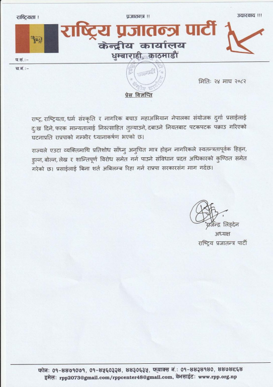 काठमाडौं । राष्ट्रिय प्रजातन्त्र पार्टी (राप्रपा)ले राष्ट्र, राष्ट्रियता, धर्म संस्कृति र नागरिक बचाउ महाअभियान नेपालका संयोजक दुर्गा प्रसाईँलाई बिनासर्त रिहा गर्न माग गरेको छ।