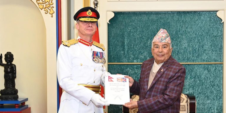 काठमाडौं । राष्ट्रपति रामचन्द्र पौडेलसमक्ष संयुक्त अधिराज्य बेलायती सेनाका मेजर जेनरल जेरल्ड एम स्ट्रिकलेण्डसहितको टोलीले गोर्खा विग्रेडको वार्षिक प्रतिवेदन प्रस्तुत गरेको छ ।
