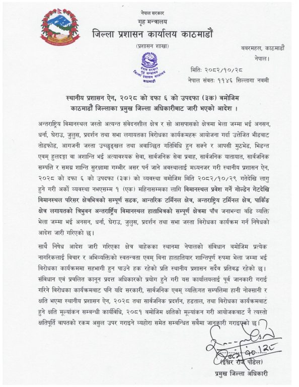 प्रमुख जिल्ला अधिकारी ईश्वरराज पौडेलद्वारा जारी आदेशमा भनिएको छ, ‘विमानस्थल प्रवेश गर्ने गोल्डेन गेटदेखि विमानस्थल परिसर क्षेत्रभित्रको सम्पूर्ण सडक, आन्तरिक टर्मिनल क्षेत्र, अन्तराष्ट्रिय टर्मिनल क्षेत्र, पार्किङ क्षेत्रलगायतको विमानस्थल हाताभित्रको सम्पूर्ण क्षेत्रमा पाँच जनाभन्दा बढी व्यक्ति भेला भई अनसन, धर्ना, घेराउ, जुलुस, प्रदर्शन तथा सभा जस्ता विरोधका कार्यक्रम गर्न निषेधको आदेश जारी गरिएको छ ।’