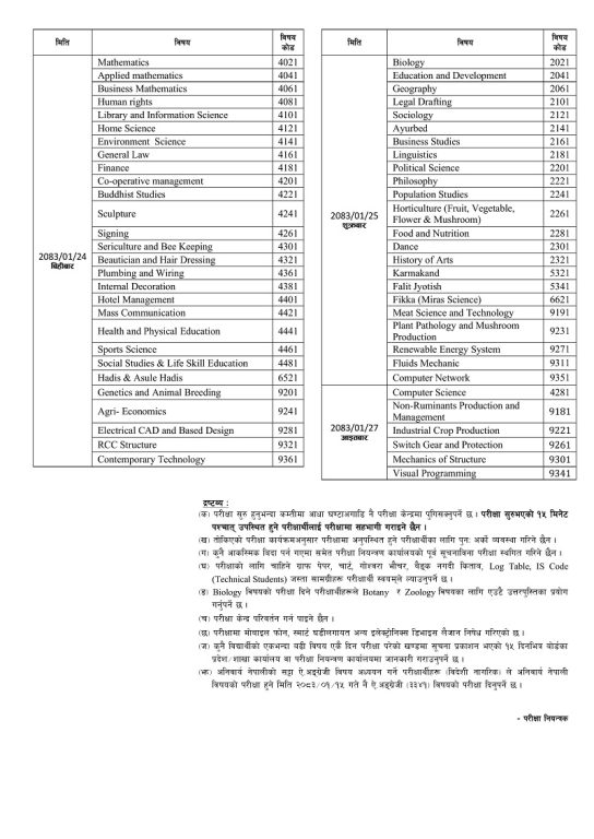 बैशाख १४ गते सोमबारदेखि शुरु हुने परीक्षा २७ गते आइतबारसम्म चल्नेछ । परीक्षा बिहान ८ बजेदेखि ११ बजेसम्म सञ्चालन हुने बोर्डले जनाएको छ ।