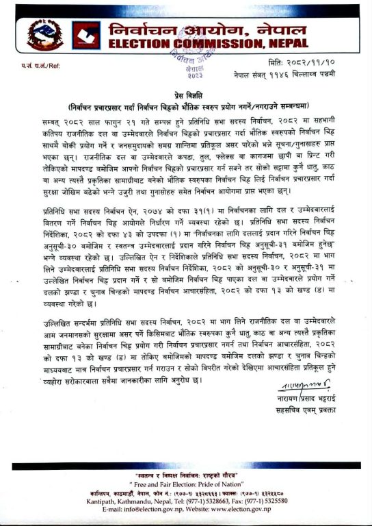‘प्रतिनिधिसभा सदस्य निर्वाचन, २०८२ मा भाग लिने राजनीतिक दल वा उम्मेदवारले आम जनमानसको सुरक्षामा असर पर्ने किसिमबाट भौतिक स्वरुपका कुनै धातु, काठ वा अन्य त्यस्तै प्रकृतिका सामग्रीबाट बनेका निर्वाचन चिह्न प्रयोग गरी निर्वाचन प्रचारप्रसार नगर्न तथा निर्वाचन आचारसंहिता, २०८२ को दफा १३ को खण्ड (ड) मा तोकिएबमोजिमको मापदण्डबमोजिम दलको झण्डा र चुनाव चिह्नको माध्ययबाट मात्र निर्वाचन प्रचारप्रसार गर्न गराउन र सोको विपरीत गरेको देखिएमा आचारसंहिता प्रतिकूल हुने व्यहोरा सरोकारवाला सबैमा जानकारीका लागि अनुरोध छ,’ आयोगको विज्ञप्तिमा भनिएको छ ।