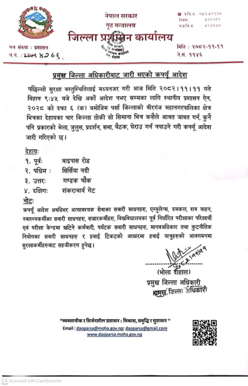 काठमाडौँ। जिल्ला प्रशासन कार्यालय पर्साले वीरगञ्ज महानगरपालिकामा कर्फ्यू आदेश जारी गरेको छ । प्रमुख जिल्ला अधिकारी भोलानाथ दाहालले महानगरका केही क्षेत्रमा बिहान ९:४५ बजेदेखि अर्को आदेश नभएसम्मलाई कर्फ्यू लगाएका हुन् ।