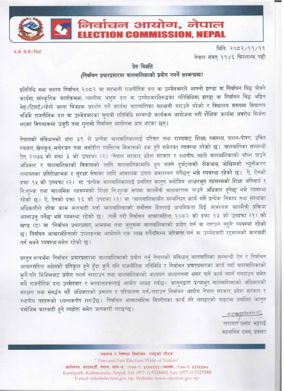 काठमाडौं । निर्वाचन आयोगले चुनावी प्रचारमा बालबालिकाको प्रयोग नगर्न निर्देशन दिएको छ । सोमबार आयोगका प्रवक्ता नारायणप्रसाद भट्टराईले विज्ञप्ति जारी गर्दै बालबालिकाको प्रयोग नगर्न आग्रह गरेका हुन् ।