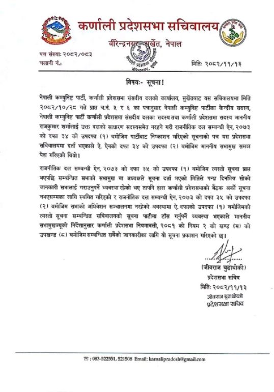 सुर्खेत । कर्णाली प्रदेशसभा सचिवालयले पूर्वमुख्यमन्त्री राजकुमार शर्मालाई प्रदेशसभा सदस्य पदबाट हटाइएको जानकारी गराएको छ । सचिवालयले बुधबार नेपाली कम्युनिष्ट पार्टीको पत्र पश्चात शर्मालाई सांसद पदबाट हटाइएको जानकारी गराएकाे हो ।