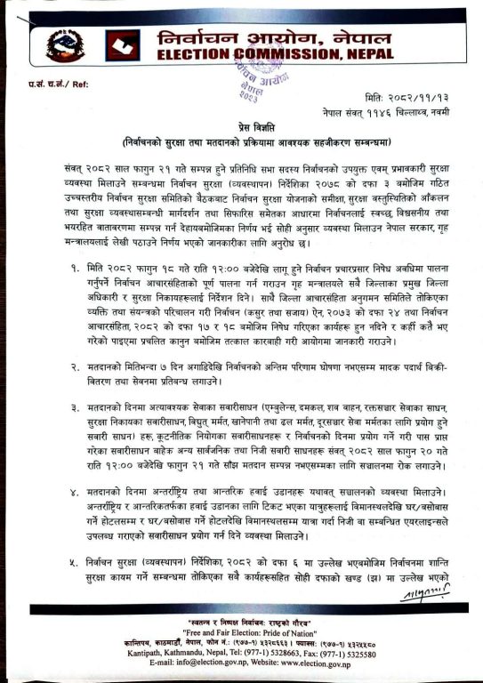 आयोगले फागुन १८ गते राति १२ बजेदेखि लागु हुने निर्वाचन प्रचारप्रसार निषेध अवधिमा पालना गर्नुपर्ने निर्वाचन आचारसंहिताको पूर्ण पालना गर्न गराउन गृह मन्त्रालयले सबै जिल्लाका प्रमुख जिल्ला अधिकारी र सुरक्षा निकायहरूलाई निर्देशन दिने जनाएको छ ।