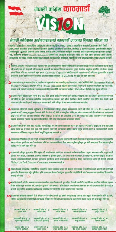 काठमाडौं । काठमाडौंमा कांग्रेसका उम्मेदवारहरूले एकीकृत प्रतिबद्धता पत्र भिजन-१० सार्वजनिक गरेका छन् । काठमाडौं, भक्तपुर र ललितपुरका गरी १५ वटै निर्वाचन क्षेत्रका कांग्रेस उम्मेदवारहरूले बिहीबार उपत्यका विकास प्रतिबद्धता पत्र सार्वजनिक गरेका हुन् ।