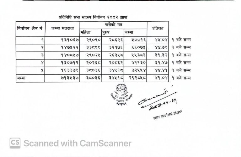 काठमाडौं । झापामा शान्तिपूर्ण रूपमा मतदान भइरहेको छ । दिउँसो १ बजेसम्म जिल्लाका पाँच क्षेत्रमध्ये एमाले अध्यक्ष केपी शर्मा ओली र रास्वपा वरिष्ठ नेता बालेन शाहले चुनाव लडेको क्षेत्र नम्बर ५ मा सबैभन्दा धेरै मत खसेको छ ।
