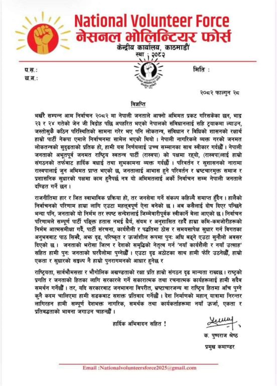 रास्वपालाई बधाई दिँदै नेसनल भोलेन्टियर फोर्सले भन्यो– जनपक्षीय काम नगरे सडक तताउँछाैँ