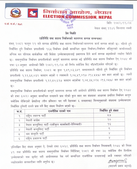 समानुपातिक सिट बाँडफाँट : रास्वपाकाे ५७, श्रम संस्कृतिले जित्याे चार सिट