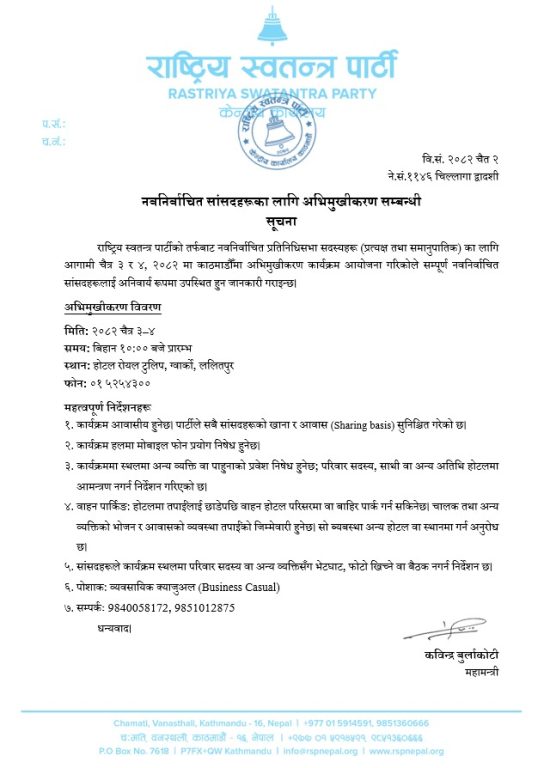 काठमाडौं । रवि लामिछाने नेतृत्वको राष्ट्रिय स्वतन्त्र पार्टी (रास्वपा) ले आफ्ना नवनिर्वाचित प्रतिनिधिसभा सदस्यहरूका लागि दुई दिने अभिमुखीकरण प्रशिक्षण कार्यक्रम आयोजना गर्ने भएको छ ।