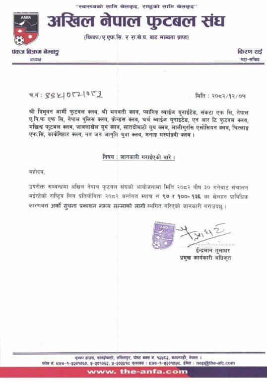 लिगमा सहभागी १७ वटा क्लबलाई पत्राचार गर्दै एन्फाले अर्काे सूचना प्रकाशन नभएसम्मका लागि ३८ वटा खेल स्थगित गरेको जानकारी गराएको छ । एन्फाको आयोजनामा राष्ट्रिय लिग गएको पुस ३० गतेदेखि सञ्चालन भएको थियो ।