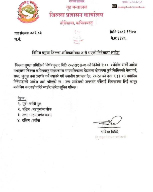 सम्भावित झडपलाई रोक्न कुनै किसिमको भेला, सभा, जुलुस गर्न नपाउने गरी जिल्ला प्रशासन कार्यालय कपिलवस्तुले आज दिउँसो २ बजेदेखि अर्को सूचना जारी नभएसम्म निषेधाज्ञा जारी गरेको हो ।